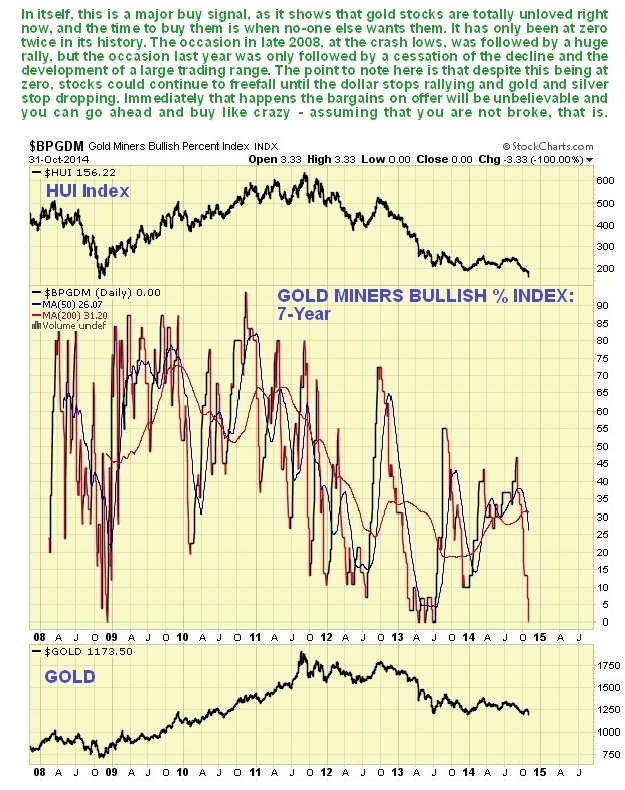 Although the immediate outlook is awful, we should keep in mind that the all-pervasive negativity towards the sector is a sign that a major bottom is not too far over the horizon. Firm evidence of that is provided by the 7-year chart for the Gold Miner’s Bullish Percent Index. This shows a truly extraordinary situation where, already, no-one is bullish in the sector. This is the “dry tinder” for an explosive rebound immediately the market senses that the bottom is in. The prolonged rotten performance of stocks relative to bullion is a reminder that we can expect stocks to front run the bottom in the metals. On only two occasions in the life of this chart have we seen such an abysmally low reading in this index. One was the 2008 general market panic low, which was followed by a huge rally in the Precious Metals sector lasting several years into the 2011 top, and the other, in the Summer of last year, was followed by a bounce and then the development of the long trading range that preceded last week’s breakdown.
