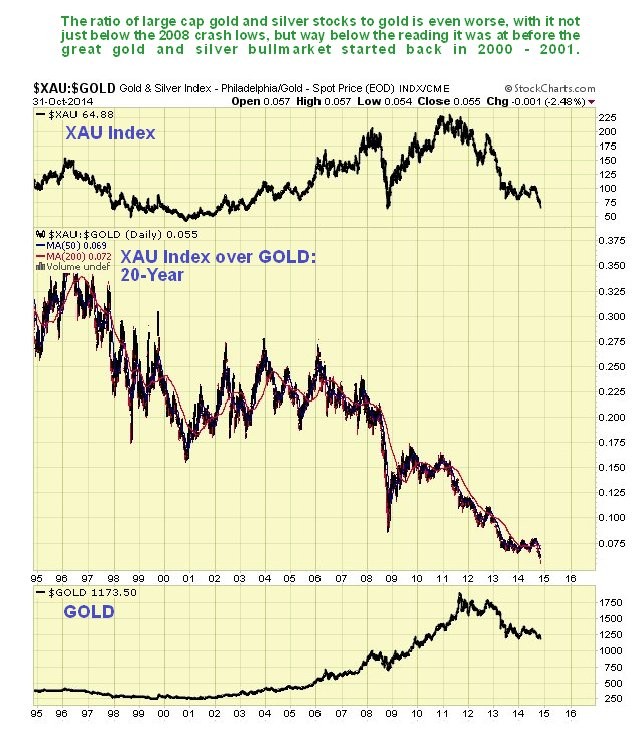 Just how horribly oversold stocks are relative to bullion is made plain by the following two charts, which show first the HUI index over gold, and then the large stock XAU index over gold, which is even worse. To understand what this means, you have to realize that when investors are fearful towards this sector they favor bullion over stocks, because while companies can and do go bust, gold bullion always survives, whatever its price in fiat. The more fearful they are towards the sector, the lower these ratios go, and as we can see, they are considerably more fearful towards the sector than they were at the 2008 crash low, and with respect to the HUI Index over gold ratio, they are as fearful towards the sector as they were in late 2000, before the great bull market in gold and silver began, and much more so with respect to large cap stocks, as shown by the XAU index over gold ratio, whose reading is much lower than in late 2000. These are clearly extremes of fear that have major bullish implications. What it means is that once the dollar’s swan song deflation rally is done, we are likely to see a humongous recovery in gold and silver stocks, magnified by the fact that many companies will have already “gone to the wall” by the time it happens.