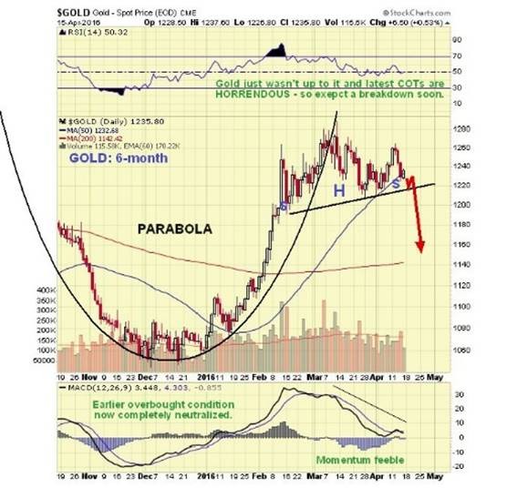 While PM stocks have broken higher, gold has stubbornly refused to and has been dropping back in recent days to complete the Right Shoulder of what is believed to be a Head-and-Shoulders top, as we can see on its 6-month chart below. Once it breaches the neckline of the pattern it should plunge. This will not be a surprising outcome, as it is very rare for a parabolic blow-off move such as we saw earlier to be followed by continued advance.