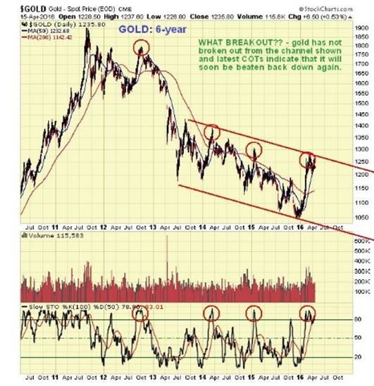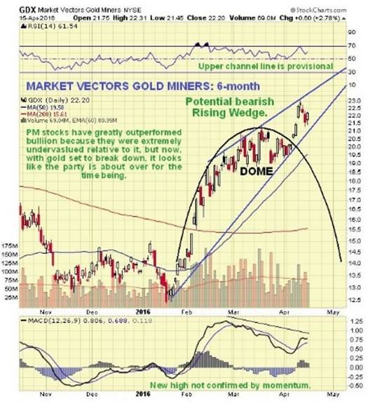 The marked outperformance of PM stocks relative to both gold and silver has been due to them being grossly undervalued relative to bullion, but now this strong performance is believed to be leading many investors into the jaws of a trap. On its 6-month chart we can see how GDX broke out of its Dome pattern and advanced to new highs, which have not been confirmed by momentum (MACD). Although this chart still looks superficially OK, what we have observed above for gold and its COTs suggests that a bearish Rising Wedge might be forming in GDX, a suspicion that will be confirmed by a sharp breakdown from the converging channel soon.