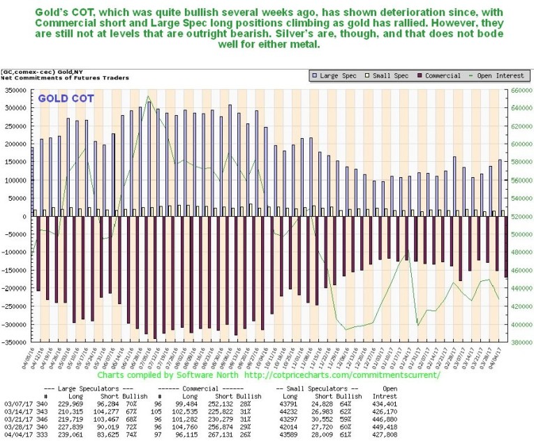 The COT picture for gold has deteriorated too in recent weeks, with Commercial short and Large Spec long positions increasing, although they are still in middling ground, and thus do not give much guidance one way or the other, unlike silver’s which are flat out bearish, and thus have negative implications for gold too.
