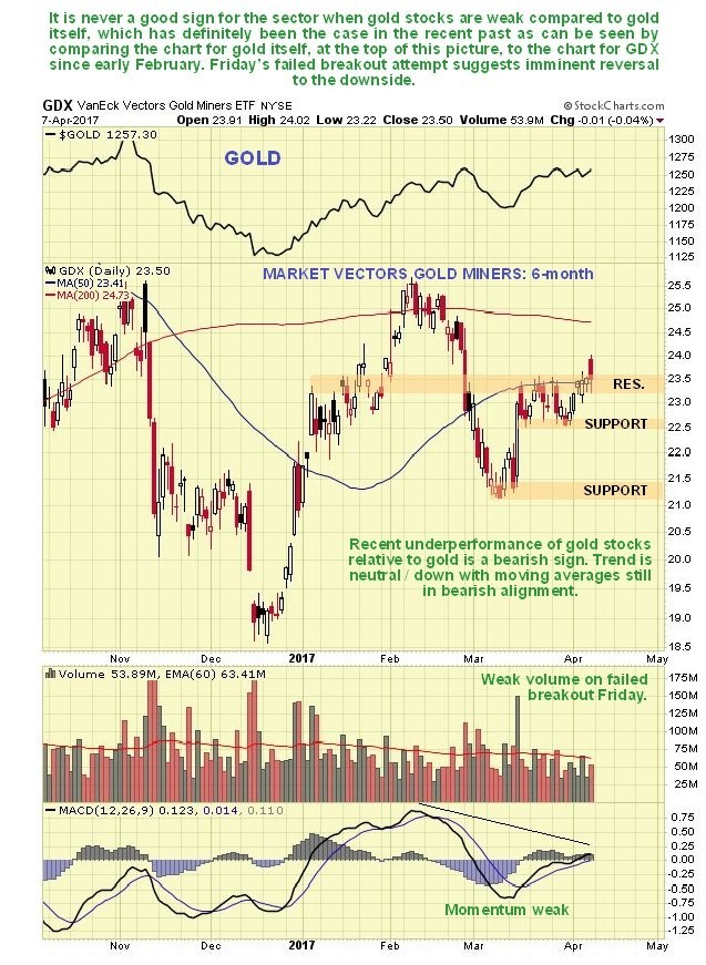 Since the cruise missile attack on the Syrian airbase may be a “one-off” and tensions are likely to ease going forward, any positive impact on gold and silver prices is likely to fade fast, and in fact it already started to before trading was done yesterday, as we will now see on the charts. So it could be said that what we talking about here is a “sell on a strike” situation, selling the PM sector on a missile strike rather than buying the broad market on a labor strike as in Britain in the distant past.