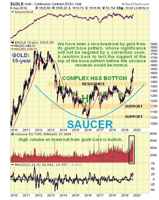 So, how far could gold react back? It happens more often than not that after a price breaks clear out of a giant base pattern, as gold did from its giant complex Head-and-Shoulders bottom or Saucer base shown on our 10-year chart, that it then returns to test support at the upper boundary of the base pattern before turning higher again. That could happen again and it would throw a lot of investors in the sector who are now of the view that we are “off to the races”. So, if it does react back that far don’t be dismayed – on the contrary it would throw up one last great buying opportunity.