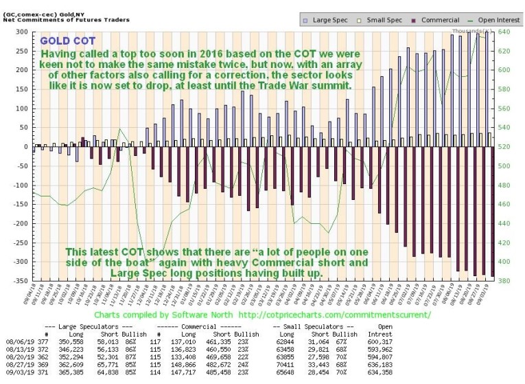 So how about COTs and sentiment? – we will now proceed to look at them. We had been wary of calling a top too soon based on the increasingly lopsided COTs, having called a top too soon during the runup early in 2016, but now, given the other factors that we have considered, in particular the negative developments last week, the latest gold COT, which shows high Large Spec long positions and heavy Commercial short positions, certainly makes a reaction back by gold now or soon a lot more likely…