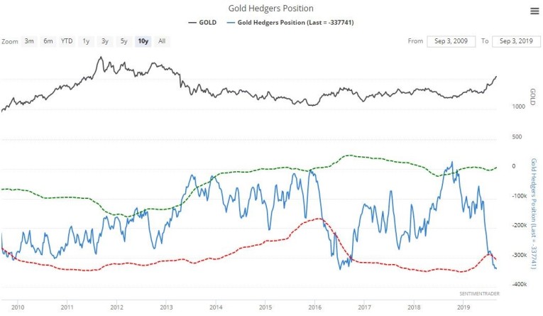 The COT is backed up by the latest Hedgers chart, which goes back to 2010, which shows that positions match the extreme reached in the Summer of 2016, which as we know was followed by a brutal correction for the rest of the year. While a correction certainly looks likely it shouldn’t be so deep, because there is a big difference this time round, which is that gold has broken out into a major new bullmarket – it was still in a basing phase in 2016.