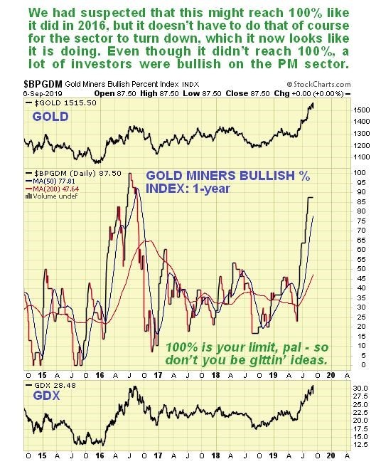 Lastly, the Gold Miners Bullish % Index is still at 87%, and while we waiting to see if it would hit 100% as it did in 2016, it doesn’t have to of course before a reversal occurs, and 87% certainly shows that enough people are bullish to warrant a trip to the fleecing shed.