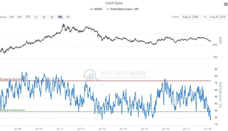 Moving on, we see that the Gold Optix, or optimism chart, is plumbing abysmally low levels, which is of course another sign that gold is probably at a bottom, because the great mass of investors are always negative and despondent at major market bottoms.
