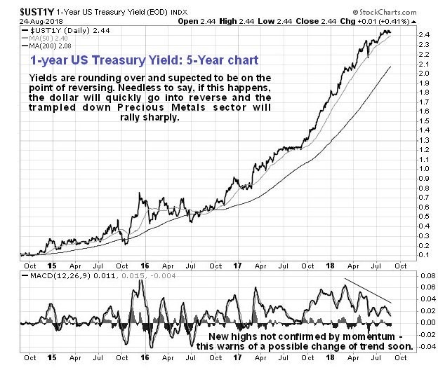Let's look at this evidence again now. We start with the 5-year chart for the 1-year Treasury Note yield, which shows that the earlier vigorous advance in rates is now running out of steam, as evidenced by the MACD momentum indicator that has not been confirming recent new highs.