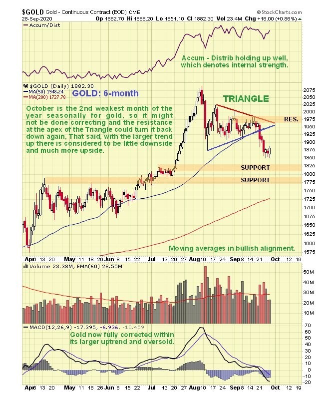 In the last Gold Market update we had thought that it might break out upside from the Triangle that was forming, mainly because of its positive Accumulation line coupled with favorable seasonal factors, but instead, after moving sideways for a while, it broke down, as we can see on its latest 6-month chart below. The good news is that no technical damage was incurred because of this breakdown, as gold is well above important support and well above its rising 200-day moving average. So the fact is that that this drop has actually improved its technical condition by completely unwinding its earlier overbought condition.