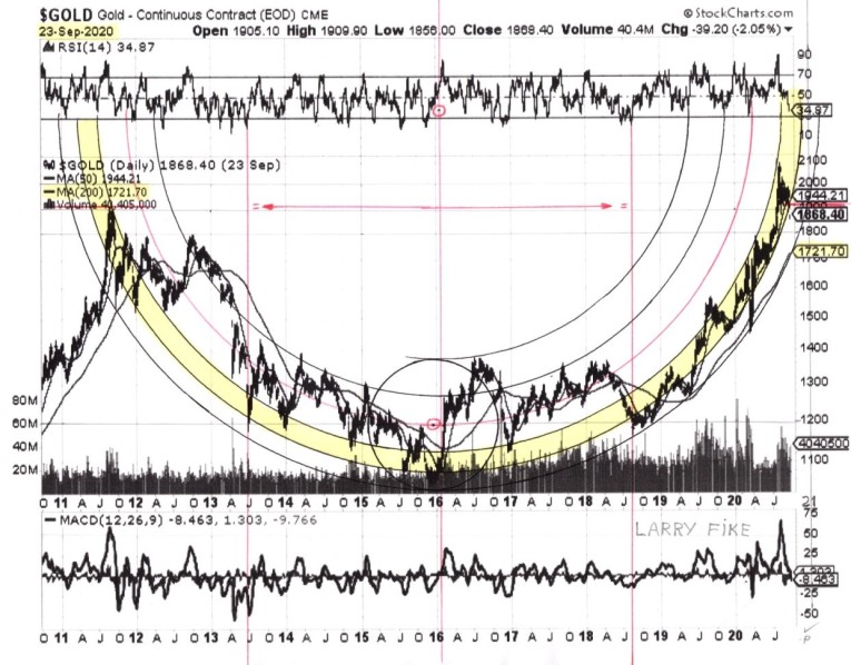 Larry’s latest gold chart suggests it will either slingshot much higher very soon, or break down from the hemispherical Bowl pattern and run off sideways for some time to form a Handle consolidation.