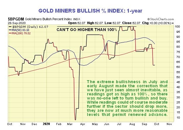 The latest Gold Miners Bullish % Index shows a considerable improvement in sentiment over the past week – far too many people had been bullish, but this has now moderated substantially, and while there is still room for improvement, this index has certainly moderated sufficiently to permit another sizeable upleg to begin.