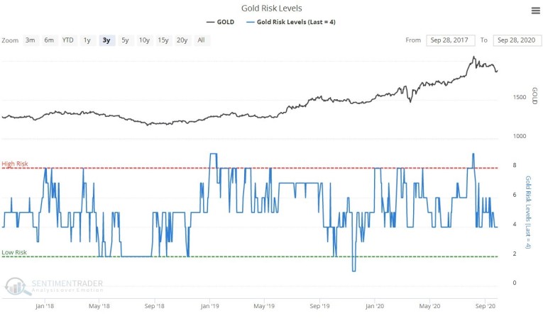 The latest Gold Risk Levels chart shows that risk for longs has moderated greatly since its early August peak…