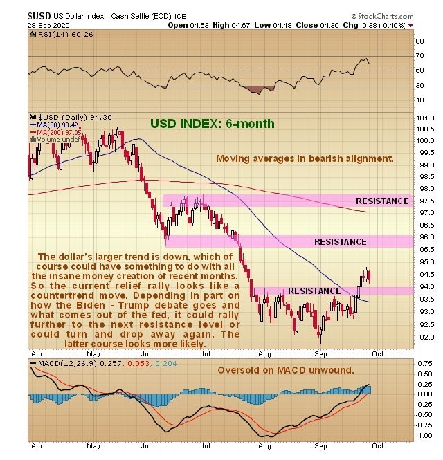 The larger trend of the dollar is down and therefore the modest rally of the past week or so is regarded as a bearmarket rally, despite it breaking above a line of resistance at 94 on the index, as we can see on its latest 6-month chart below. This “achievement” does open up the possibility of the countertrend rally running to the next significant resistance level in the 95.60 – 96 zone, although it is thought more likely that it will roll over and drop away again.