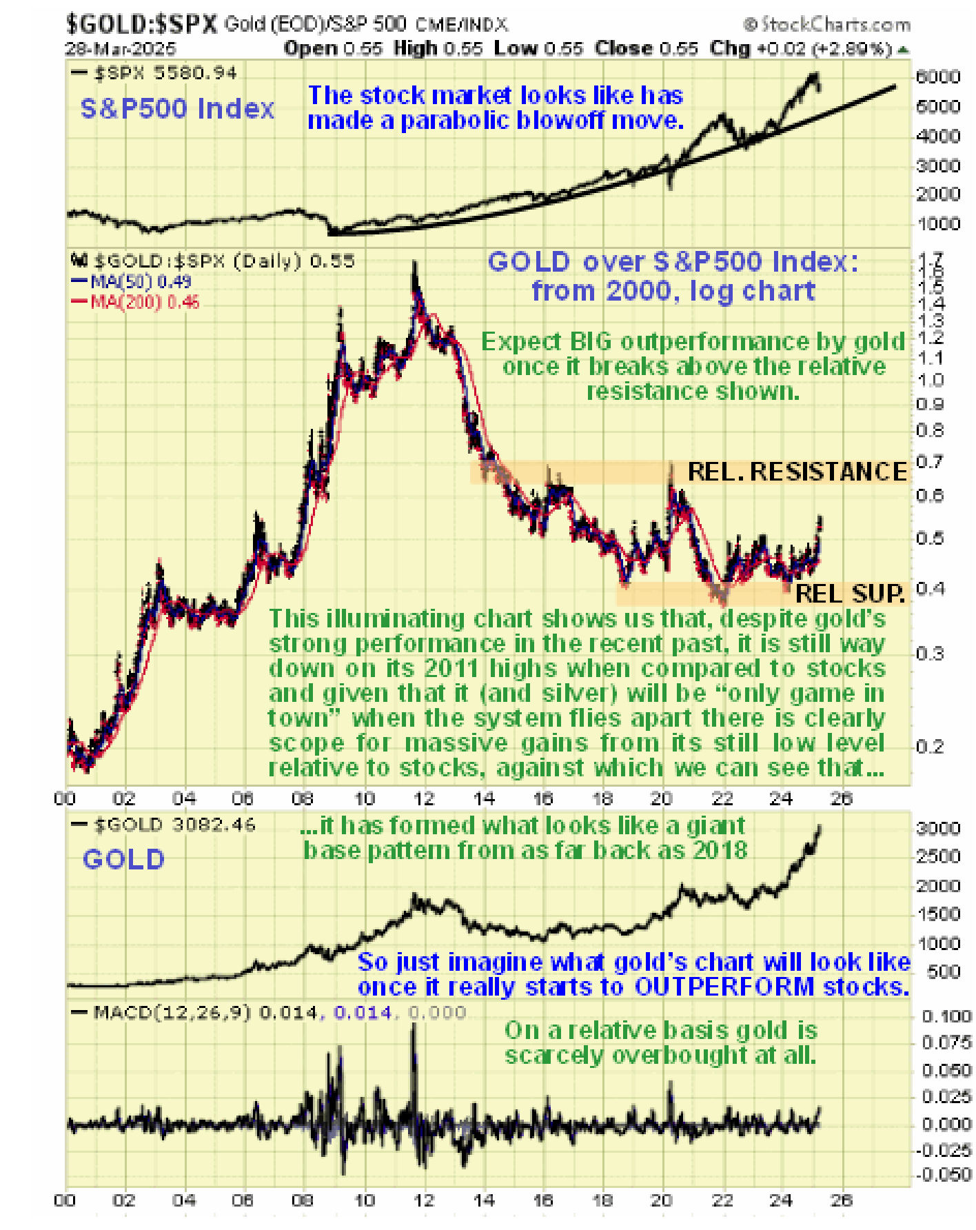 Here’s another interesting chart, also from the year 2000, which shows that gold has barely started to outperform the stockmarket yet, despite rising about 50% over the past year. Gold is still only about a third of its value relative to the stock market that it attained in 2011 and so clearly still has huge upside potential on this metric. Worried about a stock market crash dragging down the sector as happened in 2008? – don’t be, the action of the past month or two shows that this is not going to happen this time round and a big reason for this is that, apart from a few other tangibles, like other metals and minerals, gold and silver will be the only game in town.