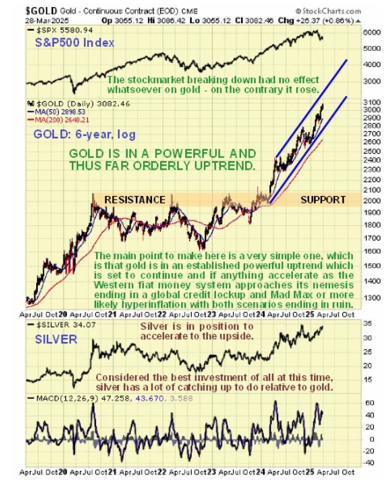 Turning now to the 6-year chart for gold we see that it has been forging ahead in an orderly uptrend for over a year now and there is no sign of it ending – on the contrary, given the outlook for currencies, this uptrend is likely to become steeper over time, eventually becoming parabolic.