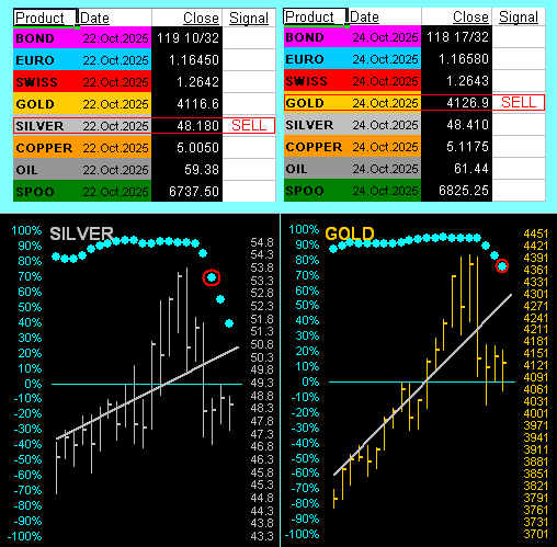 For 2025, 43 trading weeks are now complete. Therein, Gold has compiled 31 up weeks (+2.2% average gain) and 12 down weeks (-1.9% average loss). Indeed, 11 of the past 13 weeks have been up. Year-to-date, Gold is now +56.4%, still bettered by Silver +65.3%. And as we go to Gold’s weekly bars from a year ago-to-date, the aforementioned “consolidation area” appears relatively contained mid-chart by the red-dotted parabolic Short trend, during which stint price didn’t materially drop a wit. As for the ongoing blue-dotted parabolic Long trend (now 14 weeks in duration), note the “flip-to-Short” (bad idea) level for the ensuing week is 3840, some -287 points south of here (4127). So given Gold’s “expected weekly trading range” is now 165 points, a second consecutive down week ought not thwart the Long trend: