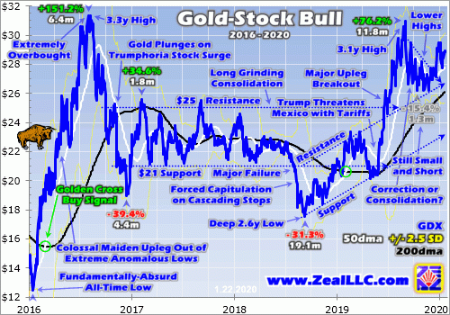 The bulls rightfully point to impressively-resilient major gold stocks holding most of last summer’s massive gains.  The bears highlight the equally-valid fact GDX has totally stalled out for nearly 5 months, failing to advance despite gold’s recent major new secular highs.  Odds are gold is going to prove the arbiter of what this sector does next.  The gold stocks are ultimately leveraged plays on gold, amplifying its fortunes.