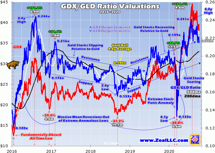 It simply looks at the ratio between prevailing gold-stock and gold price levels. While there are various permutations, the most-relevant one today is the GDX/GLD Ratio. This GGR divides the daily close of that leading GDX gold-stock ETF by the daily close of the dominant GLD SPDR Gold Shares gold ETF. When charted and analyzed over time, this ratio reveals whether gold stocks are relatively cheap or expensive.