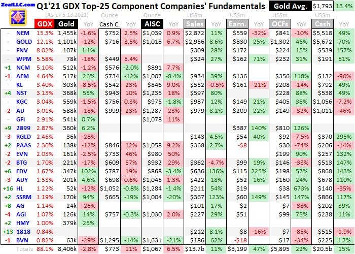 This table summarizes the operational and financial highlights from the GDX top 25 during Q1’21. These major gold miners’ stock symbols aren’t all US listings, and are preceded by their rankings changes within GDX over the past year. The shuffling in their ETF weightings reflect changing market caps, which reveal both outperformers and underperformers since Q1’20. The symbols are followed by current GDX weightings.