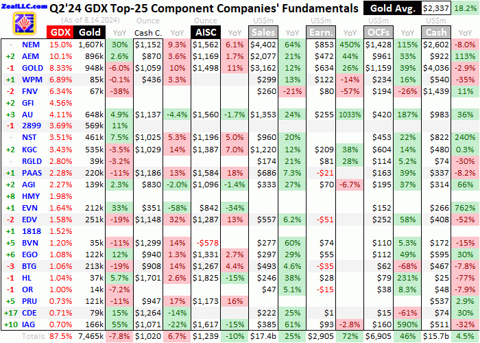 This table summarizes the operational and financial highlights from the GDX top 25 during Q2’24. These gold miners’ stock symbols aren’t all US listings, and are preceded by their rankings changes within GDX over this past year. The shuffling in their ETF weightings reflects shifting market caps, which reveal both outperformers and underperformers since Q2’23. Those symbols are followed by their current GDX weightings.