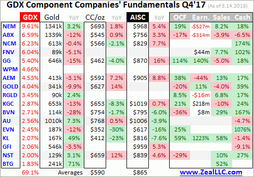 In these tables the first couple columns show each GDX component’s symbol and weighting within this ETF as of this week. While most of these gold stocks trade in the States, not all of them do. So if you can’t find one of these symbols, it’s a listing from a company’s primary foreign stock exchange. That’s followed by each company’s Q4’17 gold production in ounces, which is mostly reported in pure-gold terms.