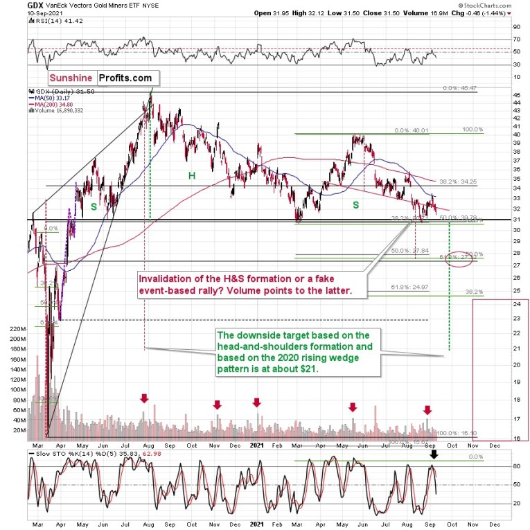 Large spikes in daily volume are often bearish, not bullish. To explain, three of the last four volume outliers preceded an immediate top (or near) for the GDX ETF, while the one that preceded the late July rally was soon followed by the GDX ETF’s 2020 peak. Thus, when investors go ‘all in,’ material declines often follow. And with that, spike-high volume during the GDX ETF’s upswings often presents us with great shorting opportunities.