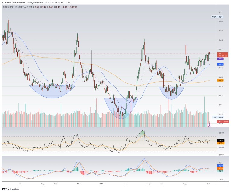 Similarly, the GDX/SPY ratio is holding serve after being under pressure the last few days. It would be preferable for GDX/SPY to hold the SMA 50 here (green arrow), but it could also fill that gap up on September 12. We’d want a higher high to be put in there.