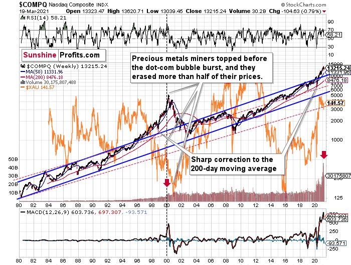 Moreover, let’s keep in mind that an unwinding of NASDAQ speculation could deliver a fierce blow to the gold miners. Back in 2000, when the dot-com bubble burst, the NASDAQ lost nearly 80% of its value, while gold miners lost more than 50% of their value.