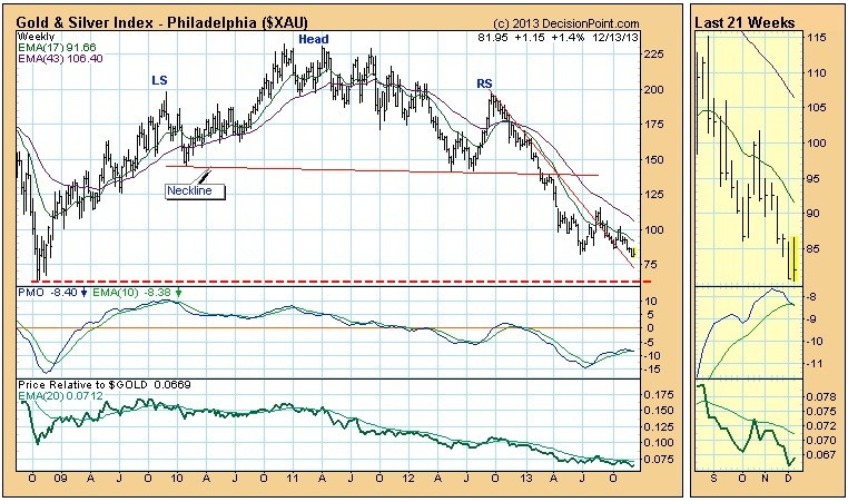 The Gold and Silver Index (XAU) represents a group of precious metal mining stocks. It is in a major decline from the 2010 top.