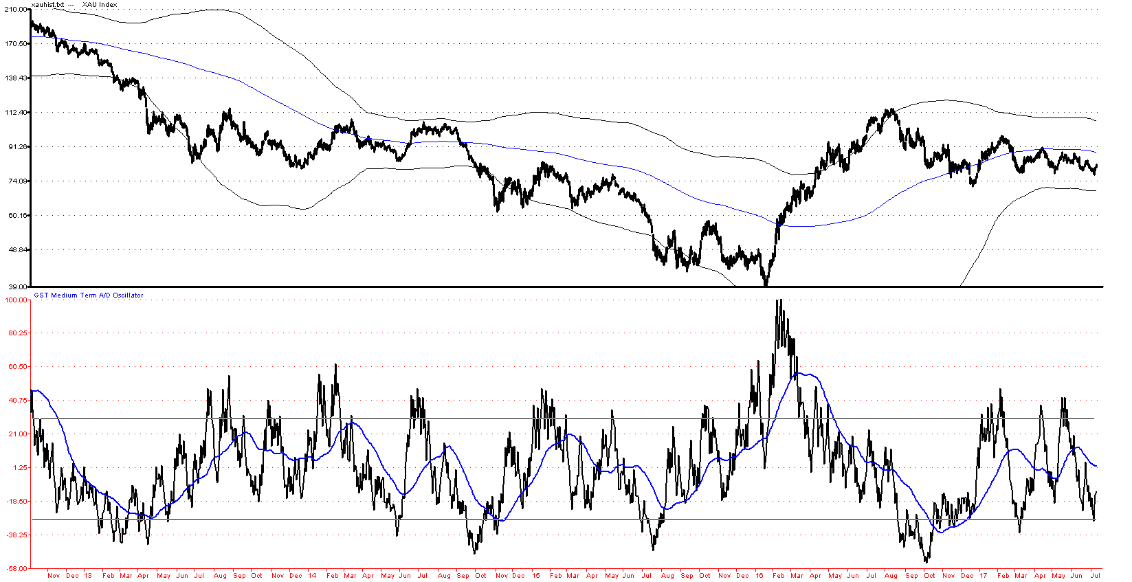 Above: XAU Index with Time Span counter showing # of days with no contact on 50 day upper band.