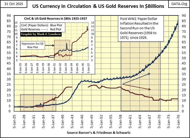 Note in the chart insert below; it was during the Great Depression, that US paper money first became decoupled from the gold held at the US Treasury, legally required to back it. When in August 1971, the US Treasury announced that the dollar was being decoupled from its $35 gold peg (temporarily), it was actually a confession of the state of the dollar since 1931.