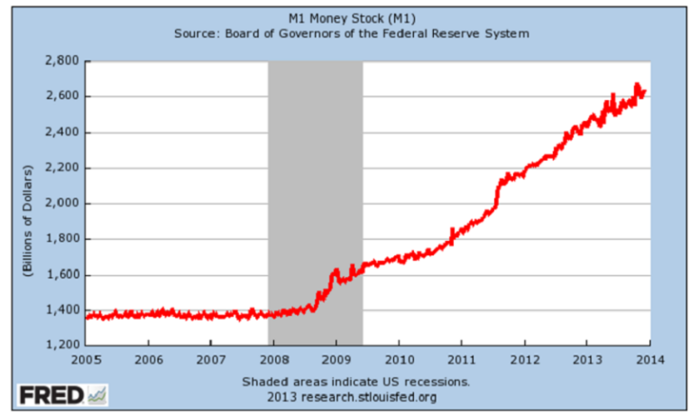 That’s a chart of M1 money supply, courtesy of the Federal Reserve Bank of St. Louis. It’s clear that since the Fed’s money printing programs began in 2008, M1 has skyrocketed.