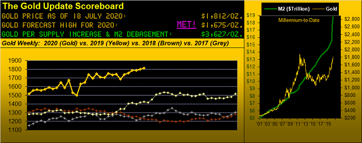 A comparatively compressed trading week 'twas for Gold, but 'twas not so narrow for the Econ Baro which went up straight as an arrow. There were 16 incoming metrics last week, of which 14 bettered their prior period and/or consensus expectation. And as we'd surmised back in March when the economy's toggle switch was flicked to "off" and down went the Economic Barometer, so has it gone up upon the switch being flicked to "on". Oh to be sure 'tis different:, folks from home working, over one million weekly Jobless Claims for filing, bankruptcies abounding, and faux dough being printed at a rate that's astounding. But from the "Where There's a Will There's a Way Dept.", as reborn above the ashes the phoenix rose, so now the Economic Barometer goes: