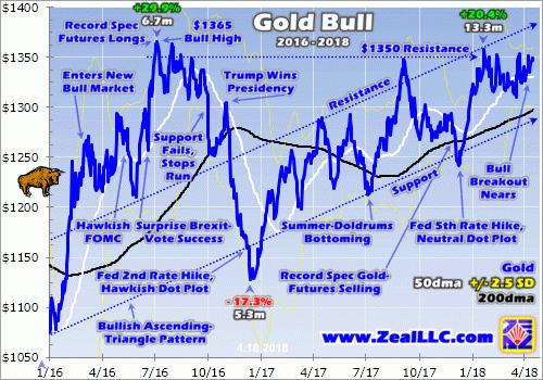 As of the latest Commitments of Traders report before this essay was published, total spec gold-futures longs are only running 25% up into their past year’s trading range. That means 3/4ths of these traders’ likely capital firepower remains available to buy back in. Believe me, if they think gold is going to break out above $1350 resistance they will flood in with a vengeance. These elite traders follow charts by necessity.