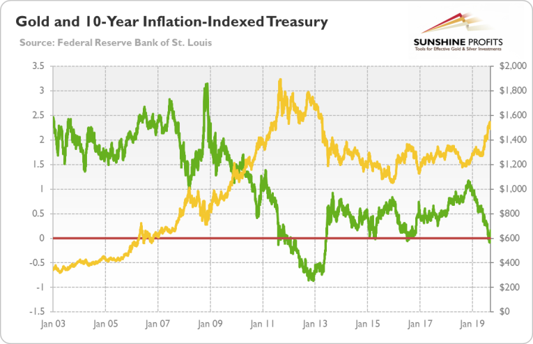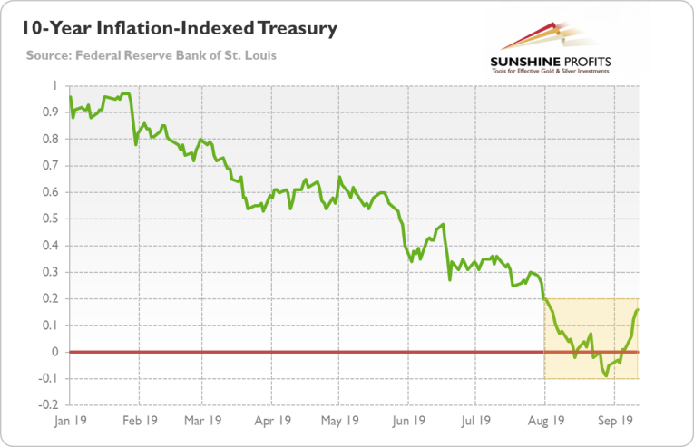 As one can see, the yield on the U.S. 10-year inflation-indexed Treasury has dived below zero at the turn of August and September. Hence, although nominal interest rates are still positive in America, the real interest rates have turned negative for a while recently. By the way, the chart also shows that the real bond yields have been gradually declining in 2019 until September, which boosted the gold prices.