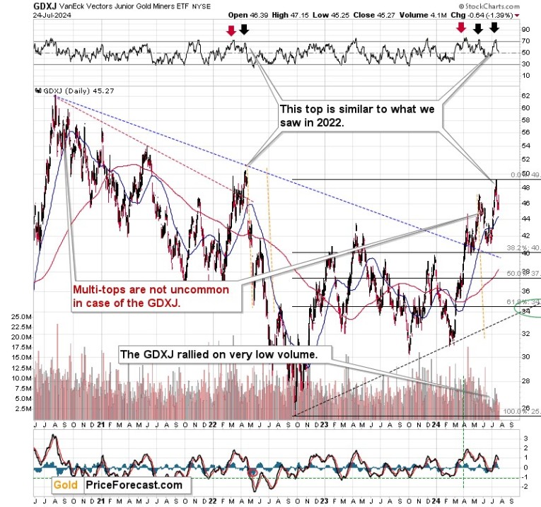 The re-test of the May highs as resistance was successful – this time, the GDXJ wasn’t able to move above this level (and the previous attempt to move above this level was invalidated) – making it even clearer that the next big move will most likely be to the downside
