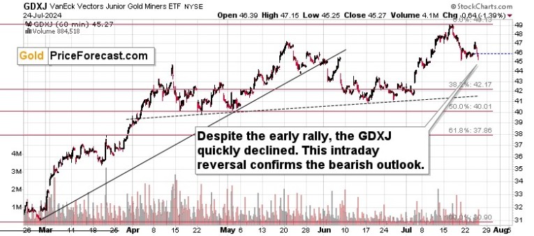 Meanwhile, the GDXJ also reversed and declined by over 1% despite the early rally. With bearish outlooks for gold and silver, it’s only natural to expect miners to move lower as well.