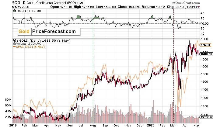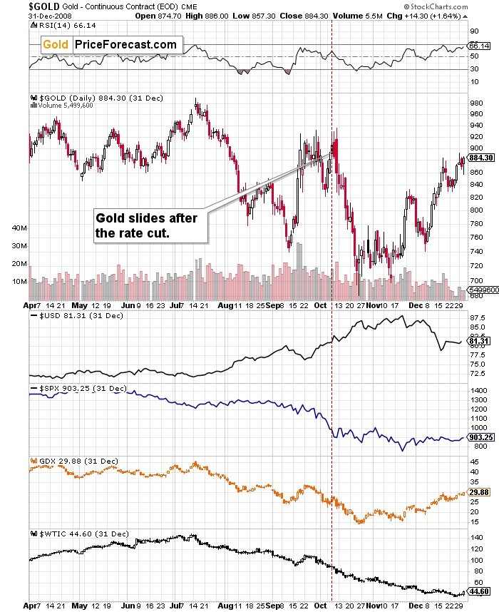 The 2008 case is particularly notable – after the October 2008 rate cut, gold truly plunged – and the same happened to gold stocks.