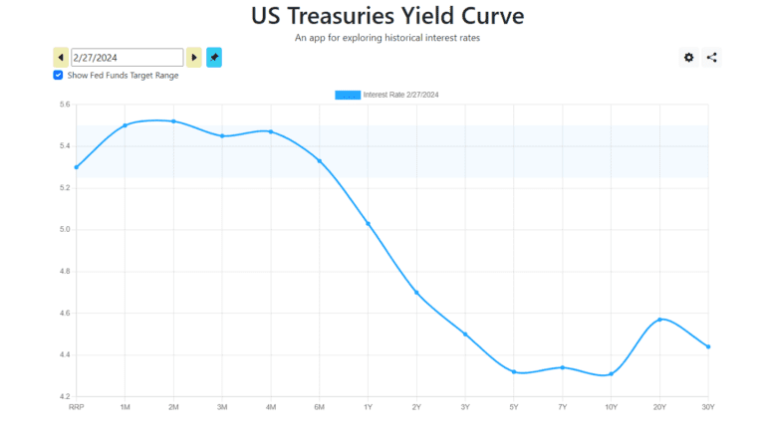 Here’s a graph of the yield curve on February 27. Not un-inverting yet, but so what?