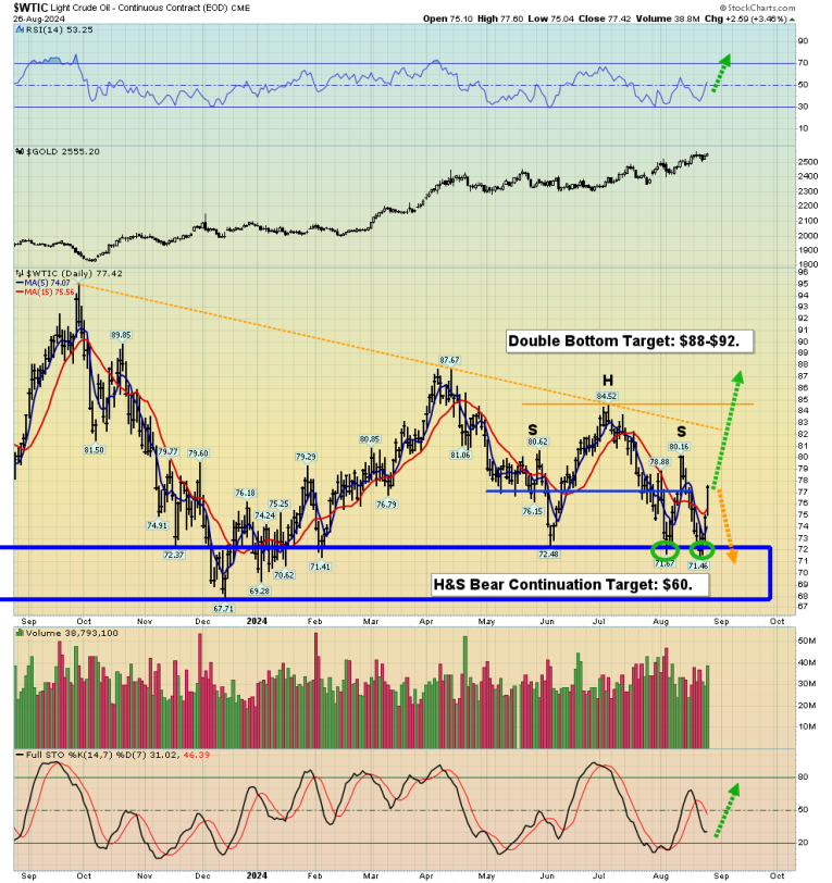 Given the rising tensions (and outright war) in the mid-East, it’s likely that the bullish double bottom overwhelms the H&S bear continuation pattern, and the oil price moves up towards $90 again.