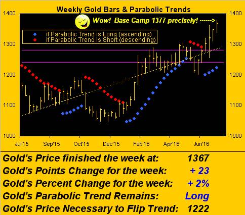 In last week's missive, (Gold then at $1,345), we modestly raised our high target for this year to the vaunted level dubbed as "Base Camp 1377". Now with Gold having settled yesterday (Friday) at $1,367, what was Gold's high trade this past week, indeed for the year-to-date, thus far? $1,377. So is that it for 2016? Keep reading.