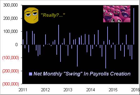 But what of that gonzo payrolls number, eh? From just a revised 11,000 of net payrolls creation in May to June's 287,000 is a "swing" of +276,000. To put that in context, here are said "swings" month-by-month for the last five years-to-date: