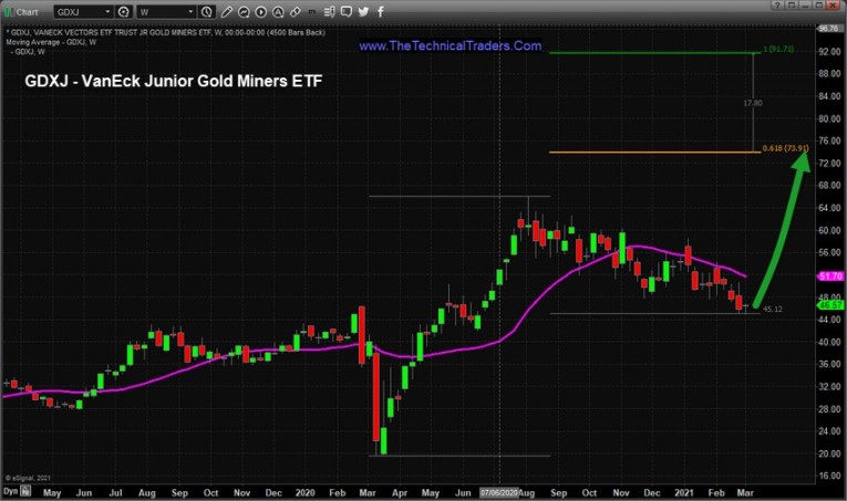 In terms of sector ETF trends, a stronger upside move in Gold would likely prompt Miner ETFs to also move dramatically higher over the next 30 to 60+ days. This GDXJ Weekly chart highlights a Fibonacci 100% measured move higher which suggests the $73.91 and $91.71 levels could become our next upside targets.