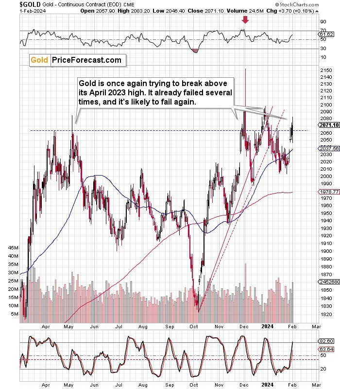 With this context, it’s clearer that gold’s attempt to move above its April 2023 high is going to be unsuccessful.