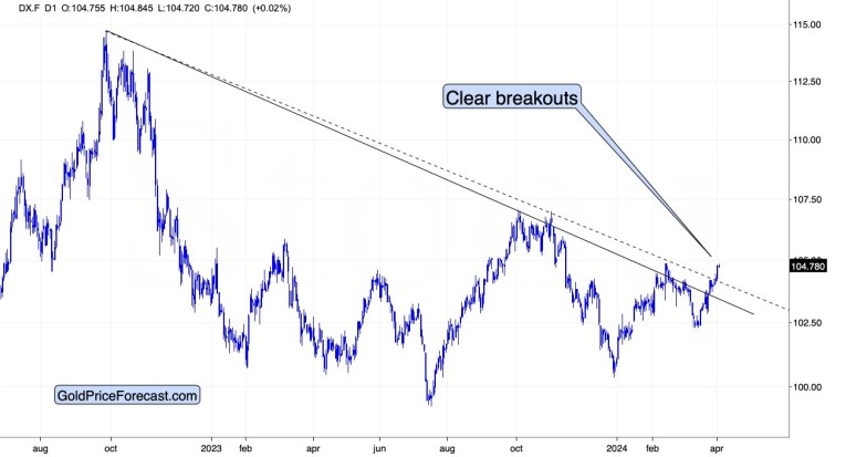 The last several days were back-and-forth trading very close to the previous highs… And that’s what already makes the current case special. The 2022 top was sharp, and it was immediately followed by a decline. The late-2023 top wasn’t as sharp, and the price even tried to move higher twice. This time, the price stayed higher – there was no decline.