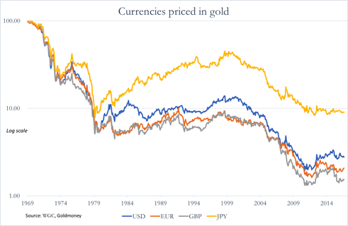 The result was the purchasing power of the dollar and the other major currencies measured in gold has all but collapsed, as shown in the chart below.