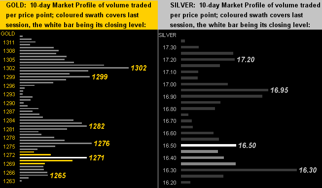 Thus as we drill down into the 10-day Market Profiles, let's stay with Silver (below right) wherein her saving supportive grace is depicted at 16.30; as for Gold (below left) the present 1271 level is the fourth-most actively-traded price through the past fortnight. But more importantly, gold's overall critical support area it need hold is The Box (1280-1240), else we fear the year is lost: