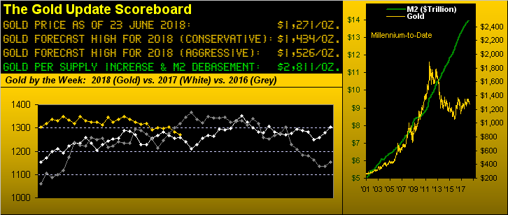 Eight years ago to the day (22 June 2010), gold's price settled above 1240 for the very first time. 14% of the trading days since then (287/2016) have found gold settling inside of what we today refer to (ad nausea) as The Box (1280-1240). Indeed if we view The Box as a single round number, gold today is "unch" from where 'twas those eight years ago. And yet the ever-debasing StateSide money supply as measured by M2 has since risen from $8.61 trillion to $14.12 trillion. What are we missing?