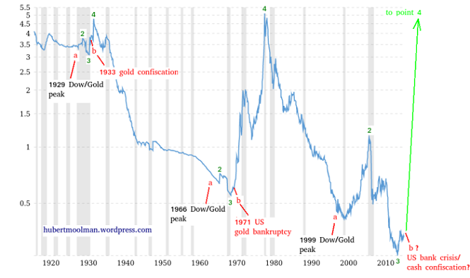 It would seem that we are now closer to point b, where that major monetary event could start to happen. An event similar to the 1933 gold confiscation (bankruptcy) and the 1971 announcement where the US ended the dollar convertibility to gold (at a fixed rate).