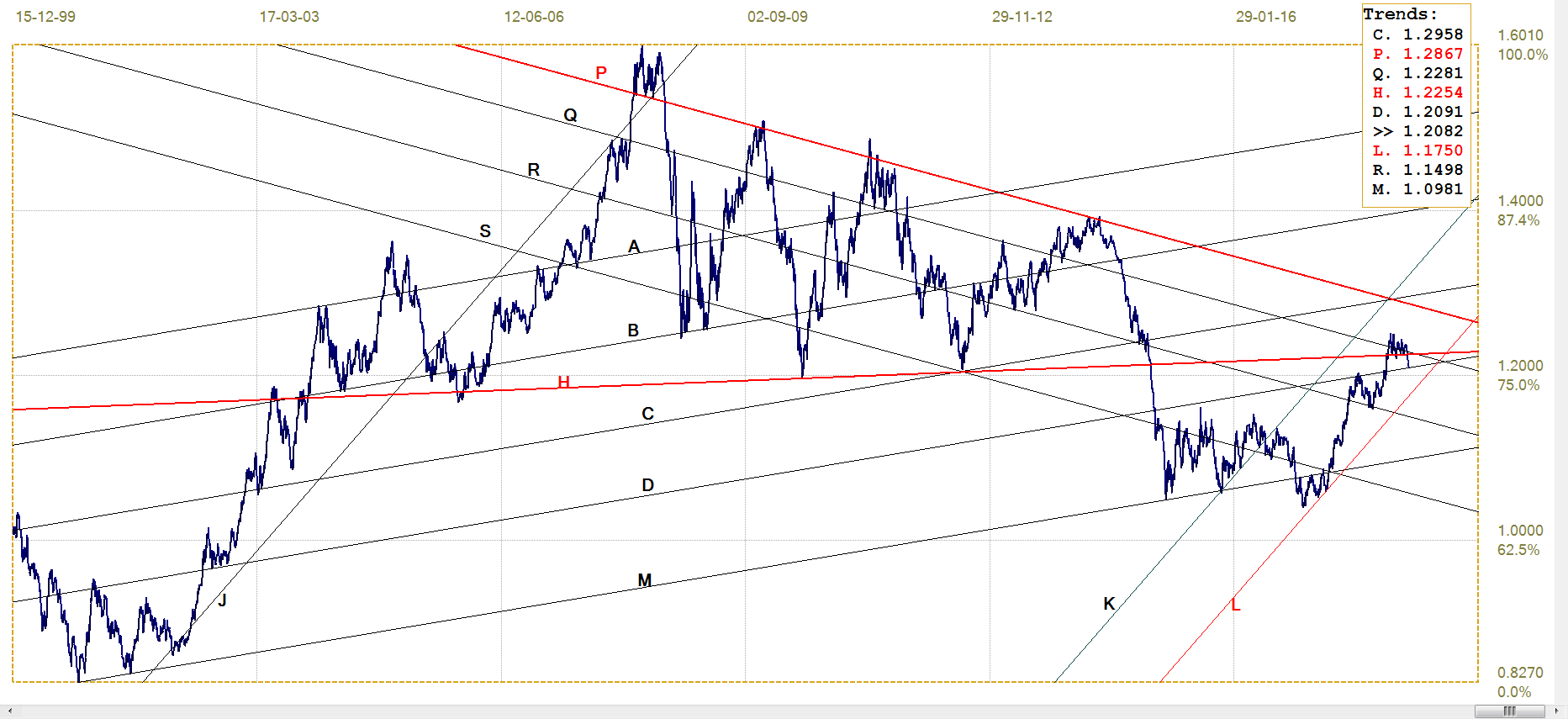 The feeling of relief that the bear had been kept at bay, at that time, ended with the reversal off line D (2.743%) that then kept the yield in the steep bear channel KL (2.90%) to break clear above line C (2.959%) and the 3% level. Given how much markets are being steered into desirable directions – for as long as possible and necessary - it is not surprising that the yield was brought back below the 3% mark, to end a fraction below line C. It now remains to be seen whether there will be a rebound higher off line C or, as happened on the previous occasion of a break above 3%, a new rally can be engineered.